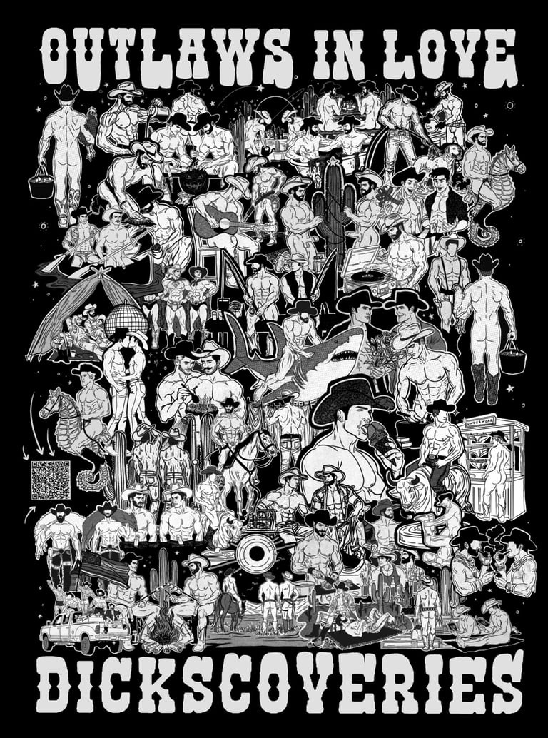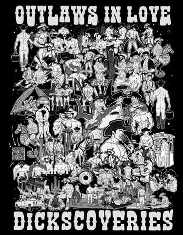 Outlaws in Love is a queer Western art series symbolizing the search for love and freedom in the Wild West. Featuring over 60 sketches, it explores hidden, domesticated relationships between gay cowboys, inspired by classic Western films and the iconic style of Tom of Finland. Rooted in the artist's early years living in Cheyenne, Wyoming, where life was filled with country music, rodeos, nature, and handsome cowboys, this series reflects a formative time when the artist realized his sexuality at a young age. Critiquing homophobic conservative legislation, this exhibition is the first in a planned series of thirteen. Dickscoveries’ "Outlaws in Love" was the headlining artist for the Long Beach Arts Council at Long Beach Pride, showcased in Starfuckker Magazine, and featured monthly at Jeremy Lucido’s “Hogtied” country night at Precinct Nightclub in downtown LA. It has also participated in two Dandyland Erotic Markets, furthering its mission to celebrate queer love and creativity. The project continues to evolve with exciting collaborations, including work with artist Zach Grear, SuperTwunk, and album artwork for queer country singer Paisley Fields.